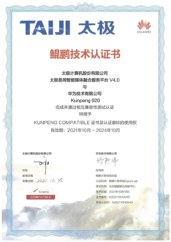 “太極智能媒體融合服務解決方案”已與華為鯤鵬完成兼容性互認證